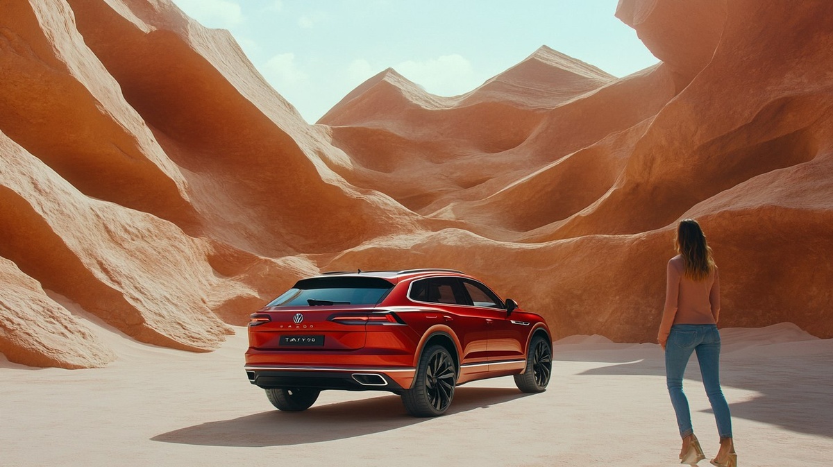 Создано на основе запроса: drone shot of a red volkswagen tayron suv during day in front of a huge sand shape like architecture, abstract no