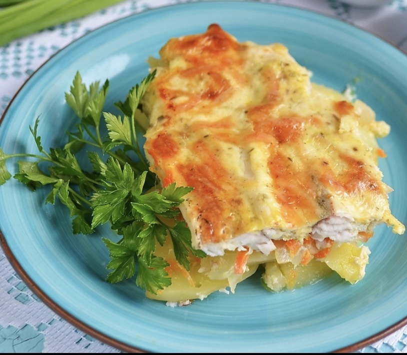 Подавайте запеченную картошку с рыбой и овощным, дополнив легким салатом, зеленью. Запекайте блюдо на средней или нижней полке духовки, накрывать фольгой или крышкой не нужно, благодаря сырно-сметанной заливке картофель и рыбка не будут сухими, получится вкусно и красиво, золотистая сырная корочка вам обеспечена! Итак, смотрите подробнее мой рецепт и вы узнаете, как приготовить рыбу с картошкой в духовке! Ингридиенты: Рыбное филе: 700 Грамм, Картофель: 6-8 Штук, Лук репчатый: 2 Штуки, Морковь: 1-2 Штук, Сметана: 1 Стакан, Сыр твердый: 1 Стакан (с горкой), Яйцо крупное: 1 Штука, Соль, перец черный молотый: По вкусу, Специи: По вкусу, Растительное масло: 2-3 Ст. ложек Приготовление: 1. Подготовьте продукты: очистите все овощи, натрите на крупной терке сыр, вымойте рыбку и дайте стечь влаге. 2. Лук порежьте кубиками, морковь натрите на крупной терке. Обжарьте овощи до полуготовности на ложке растительного масла, посолите по вкусу. 3. Для сырно-сметанной заправки соедините следующие