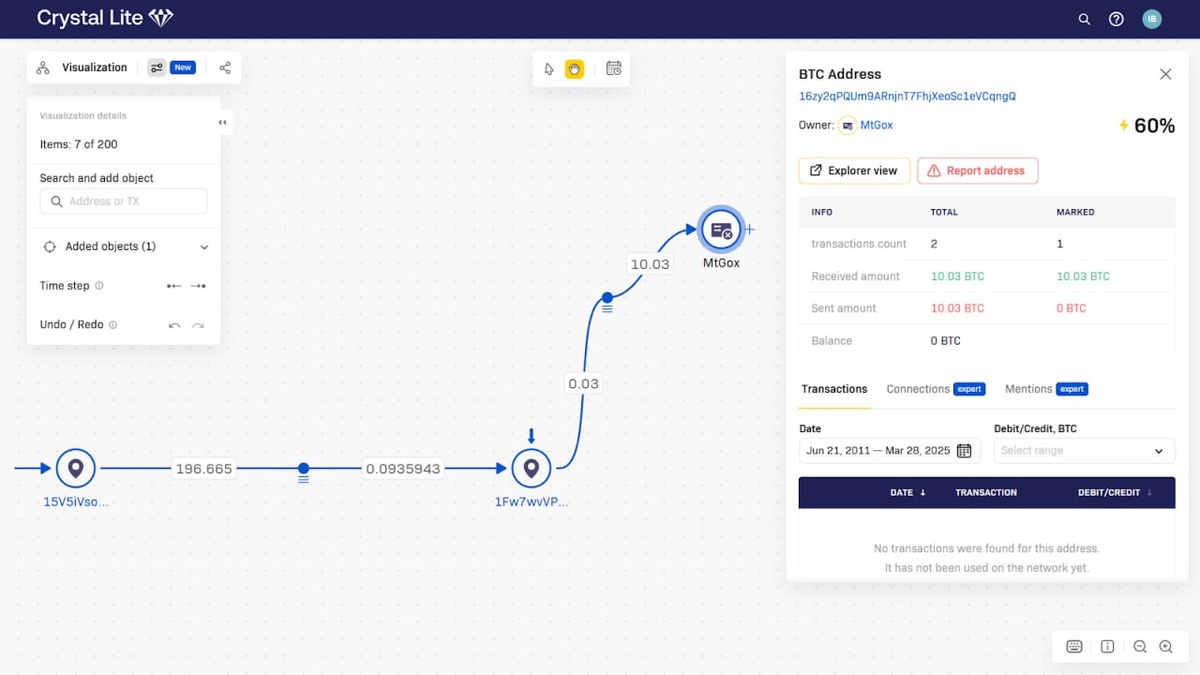 🔤 Crystal Lite В 2022-м году я на все лады расхваливал Crystal Explorer — младшую, но зато бесплатную версию одного из самых известных на тот момент инструментов для расследований в блокчейне Bitcoin-а. Осенью того же года компания Crystal сперва прикрыла сервис для россиян, а потом и закрыла вовсе. Причина проста: разработчики — украинцы. Хоть и обосновались в США. Однако в 2025-м году произошло возвращение сервиса. Не триумфальное, но все же. Сервис, как и раньше, бесплатен. Он позволяет проводить несложные расследования по биткам и безвозмездно идентифицирует (привязывает к сущностям) некоторое количество кошельков в день. Crystal Explorer также имеет приятный в использовании обозреватель блокчейна и интуитивно понятную систему графовой визуализации данных. 🍪 Поддержать канал 📱 НАШИ КОНТАКТЫ #⃣ #OSINT #BTC #BLOCKCHAIN