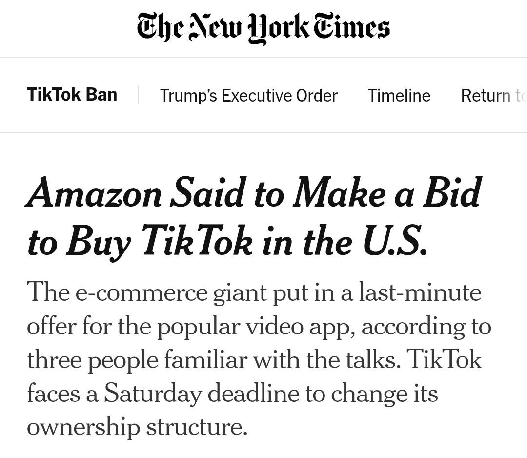 Amazon makes last-minute bid to buy TikTok Saturday deadline for TikTok in US to be bought from Chinese owner or get BANNED. Would you want TikTok owned by Amazon? #US #TikTok