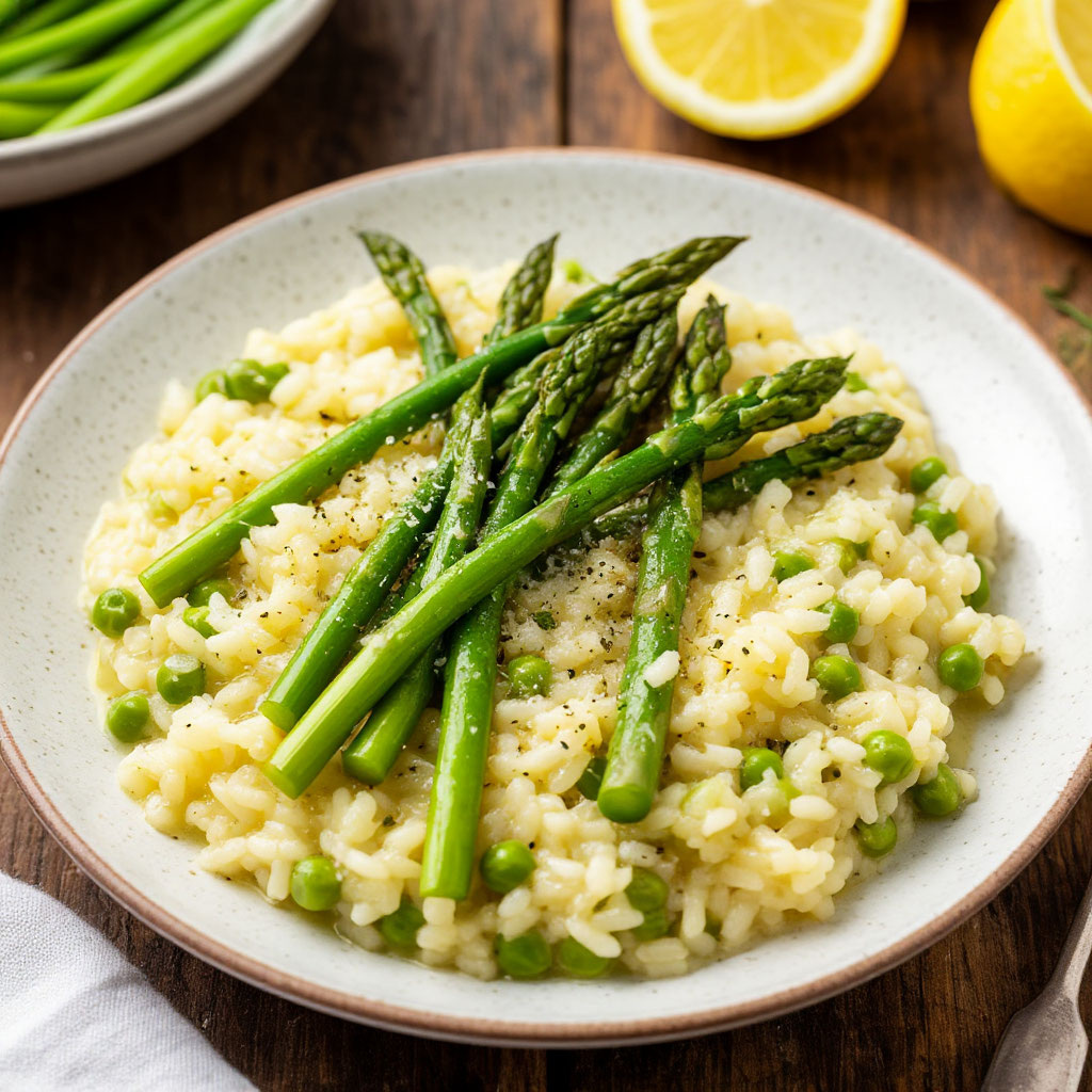 Это блюдо — воплощение весны на тарелке: кремовая текстура ризотто, хрустящие кусочки спаржи и легкая цитрусовая нотка. Идеально для легкого обеда или элегантного ужина.