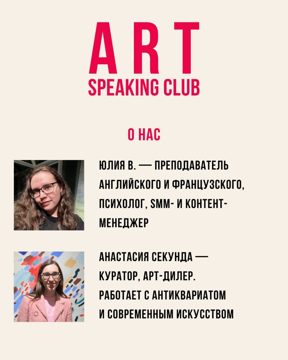 Вчера никуда не ходила, но продолжаю звать вас на наш Разговорный Клуб об искусстве 🧡 Он подойдёт даже для тех, у кого слабый английский, но очень хочется на нем заговорить. С нами будет профессиональный педагог Юлия, так что все будет чётко. Будем болтать о себе, об искусстве и своих эмоциях, будем пить чай и есть конфеты. Первая встреча уже в субботу 🗓 Чтобы записаться, пишите мне в личку @anastasia_secunda #artspeakingclub #секунда_события