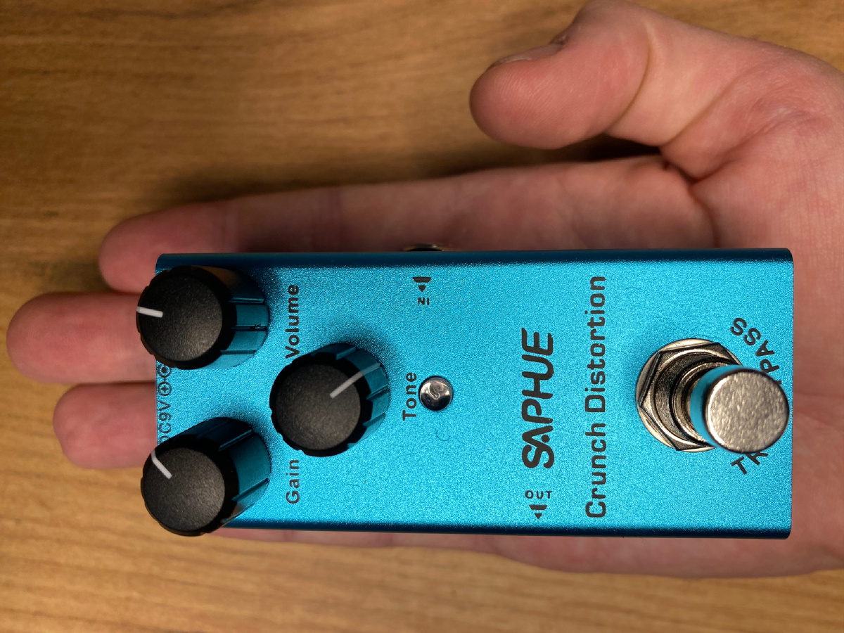 Для одного мероприятия позарез нужна была педаль эффектов с возможностью быстрого переключения звука — с дисторшна на чистый. Только два эффекта и минимум манипуляций. В итоге было принято решение найти недорогую педаль на маркетплейсе. Самой дешёвой оказалась Saphue Crunch Distortion. Приобрёл я её в районе 1500 рублей, но сейчас такую можно легко найти за 1100 рублей. Педаль эффектов легко помещается в ладонь, что изначально вызвало позитивные впечатления, но на репетиции пришлось привыкать — нога соскальзывала, и педаль переворачивалась. Этот момент нужно учитывать или сразу крепить её на педальборд. На педали расположены всего три тумблера и одна кнопка. Первый отвечает за уровень дисторшна, второй регулятор — за громкость, а третий — за тон. К сожалению, глубокого эквалайзера здесь нет, поэтому желательно дополнительно использовать другие устройства или надеяться на звукорежиссёра. Также есть индикатор, который показывает, в каком режиме в данный момент находится педаль. Педаль пр
