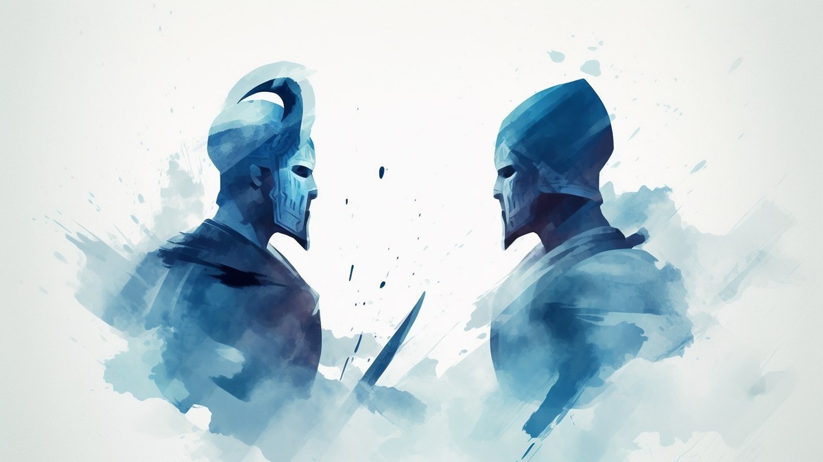 Создано на основе запроса: A minimalist illustration of two ancient warriors facing each other, drawn in black and white ink, simple geometric shapes, symbolic of human conflict, 2D flat design, blue tone watercolor style --- Автоперевод: Минималистская иллюстрация двух древних воинов, с которыми сталкиваются друг друга, нарисованные черно -белыми чернилами, простые геометрические формы, символические человеческие конфликты, 2 -й плоский дизайн, синий тон акварельный стиль Как тебе такая иллюстрация? 🤔 https://dzen.ru/id/65c0c65c86e4f837c27b24d7 #ИИ #AI #нейросеть #midjourney #art