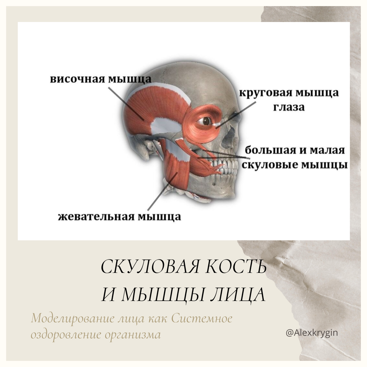 И посмотрите на риснуке какие и как мышцы прикреплены к скуловой кости – большая и малая скуловые. Большая скуловая связана ещё и с круговой мышцей рта, о которой мы уже говорили и её влиянии на нашу пищеварительную систему.