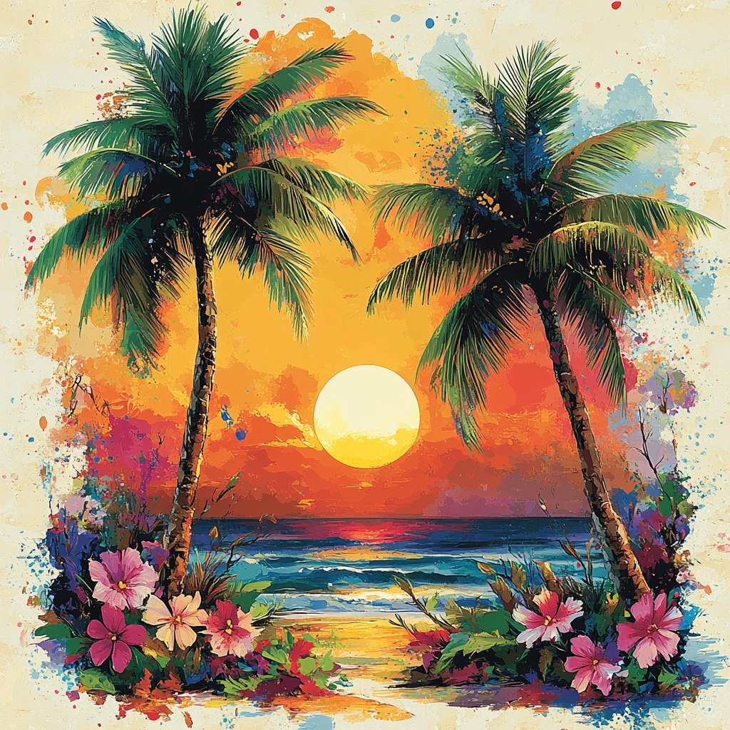 Создано на основе запроса: The pattern is set against a light - colored background. There are two palm trees with a colorful gradient effect on their fronds, showing shades of green, red, blue, etc., and brown trunks. Behind the palm trees is a magnificent seaside sunset scene. The sun is a bright yellow, and the surrounding sky shows a gradient from pink to orange, with the sea in blue. In the foreground are several brightly - colored flowers, including pink and white ones, surrounded by green leaves and some colorful splatter decorations. The overall style is rich in color, full of the splendor and vitality of a summer beach. --- Автоперевод: Узор устанавливается на светло -цветном фоне. Круто вышло? 🤔 https://dzen.ru/id/65c0c65c86e4f837c27b24d7 #ИИ #AI #нейросеть #midjourney #art