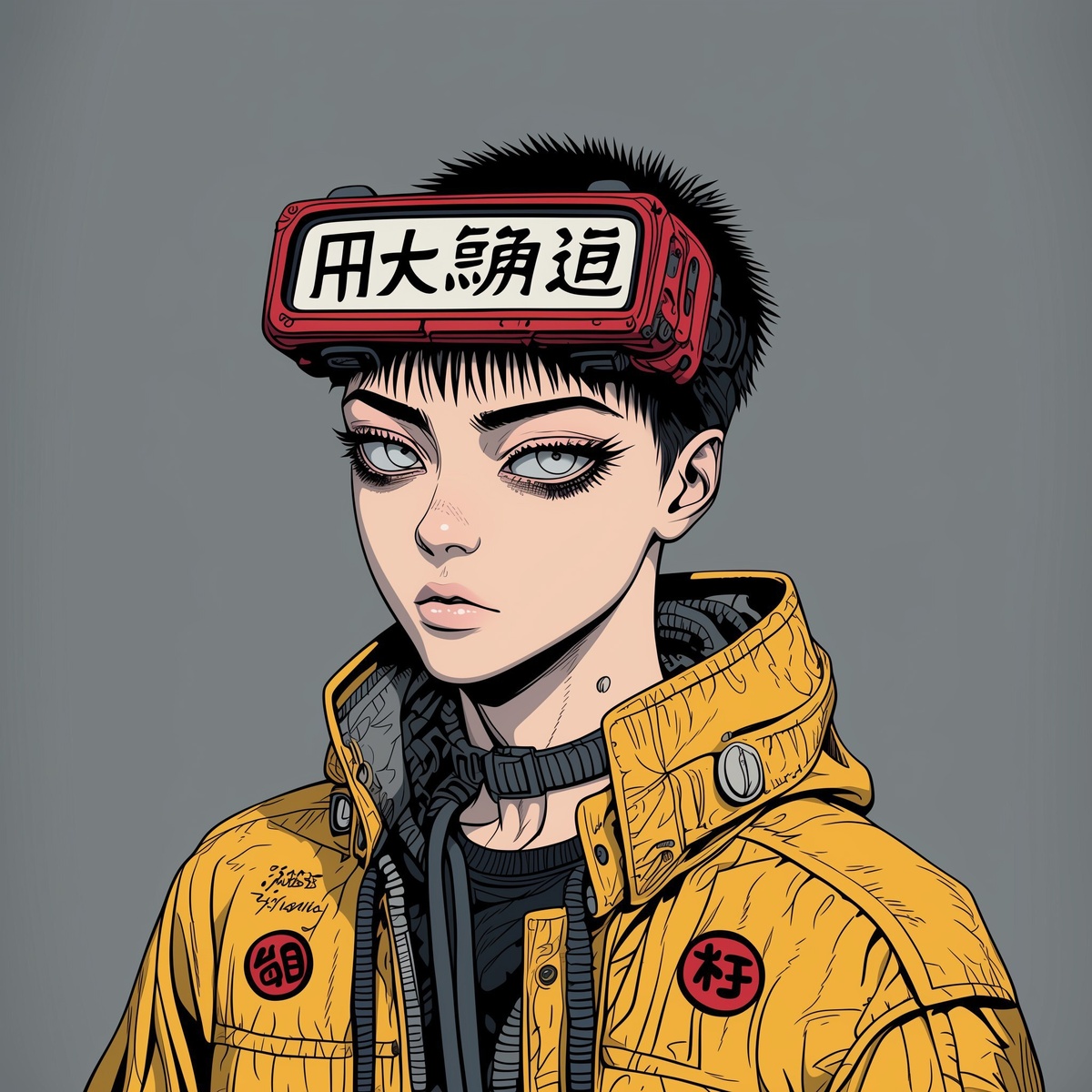 Создано на основе запроса: profile portrait Katsuhiro Otomo - Akira style of a teenage female hacker with side-shaved hair, wearing a bright yellow windbreaker with graffiti tags on the sleeves and high-tech augmented reality goggles strapped across her forehead, loose neck cables draped under the collar, soft snarl on her face, clean grey background, gritty texture and cel-shaded streetlight highlights, 8K resolution --- Автоперевод: Портрет профиля Katsuhiro Otomo-стиль акира подростка женского хакер с боковыми волосами с ярко-желтыми ветровыми бирками с граффити-метками на рукавах и высокотехнологичными точками с дополненной реальностью, нажиманными на ее лбу, кабели с накидкой на воротничках, мягкий рыча Как тебе такая картинка? 🤔 https://dzen.ru/id/65c0c65c86e4f837c27b24d7 #ИИ #AI #нейросеть #midjourney #art
