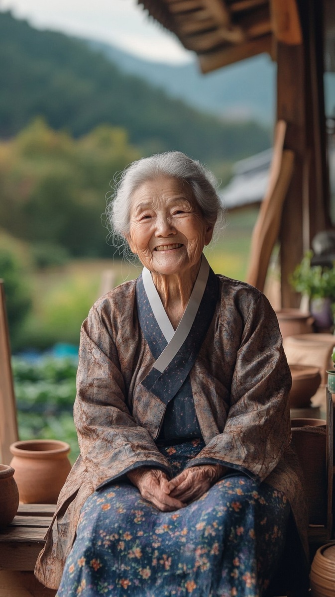 Создано на основе запроса: A realistic portrait of a 110-year-old Korean rural grandmother sitting on a wooden porch of a traditional countryside house. She is wearing simple hanbok or clean traditional clothes, smiling warmly with deep wrinkles, showing a sense of peace and wisdom. Around her are earthenware pots, green mountains or a vegetable garden in the background. Soft natural sunlight illuminates her face. The atmosphere is calm, healthy, and full of life. Photographic style, high detail
