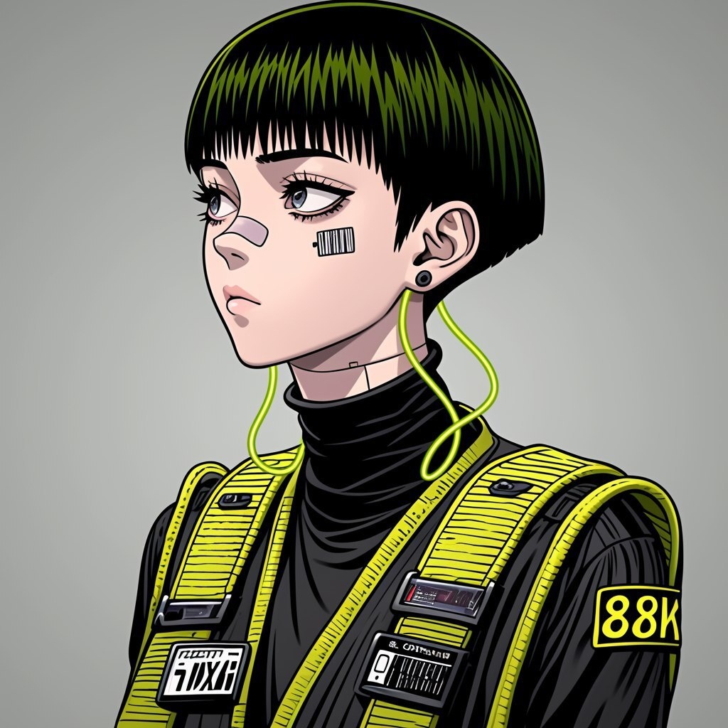 Создано на основе запроса: profile portrait Katsuhiro Otomo - Akira style of a teen girl with bobbed dark green hair and cheek-mounted biometric implants, wearing a loose-cut urban utility vest in neon green over a fitted black turtleneck, glowing neckline wires looped from shoulder to shoulder, comm badge on chest strap, clean grey background, high contrast cel-shading in 8K
