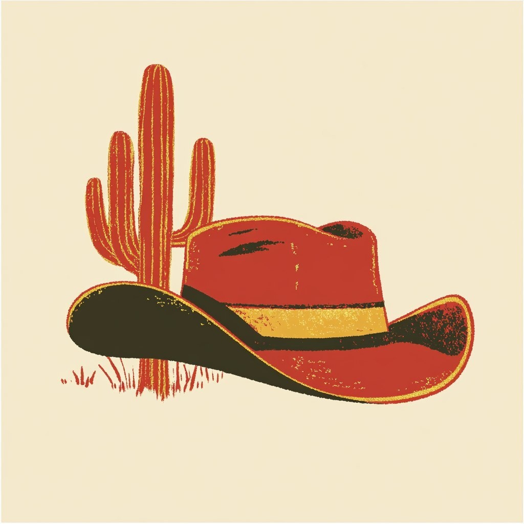 Создано на основе запроса: A simple, minimalistic clip art illustration featuring a cowboy hat and a cactus in a red and gold color palette