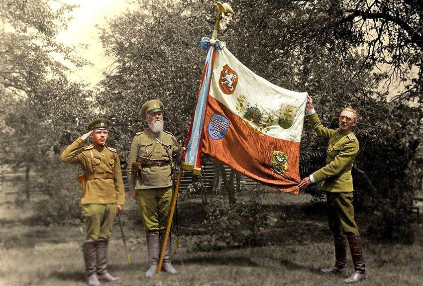 Важнейшие для будущей Чехословакии события происходили в годы Первой мировой страны в трех странах: США, Франции и России, где жило более 100 000 чехов и словаков. Уже в августе 1914 г. в Киеве была сформирована Чешская дружина (на фото ниже освящение ее знамени, вышитого московскими чешками), а с марта 1915 г. в нее начали принимать многочисленных перебежчиков из австрийской армии. К концу года дружина становится полком, а затем бригадой.
