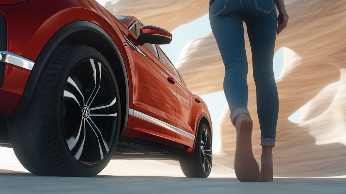 Создано на основе запроса: shot from a ground perspective of a red volkswagen tayron suv during day in front of a huge sand shape like