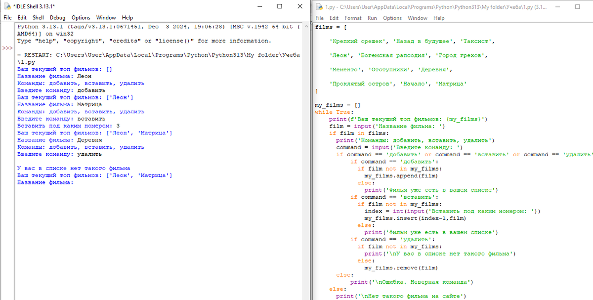 Мы поддерживаем свой киносайт и хотим сделать так, чтобы пользователи после регистрации могли создать собственный рейтинг фильмов из тех, которые есть на сайте. Вот сам список фильмов (конечно же, можете брать свои): films = [ 'Крепкий орешек', 'Назад в будущее', 'Таксист', 'Леон', 'Богемская рапсодия', 'Город грехов', 'Мементо', 'Отступники', 'Деревня', 'Проклятый остров', 'Начало', 'Матрица' ] Напишите программу, которая позволяет добавлять в свой рейтинг фильмы, удалять их оттуда, а также вставлять на нужное пользователю место. Обеспечьте контроль ввода и сделайте так, чтобы в список нельзя было добавить один и тот же фильм несколько раз. Пример:
