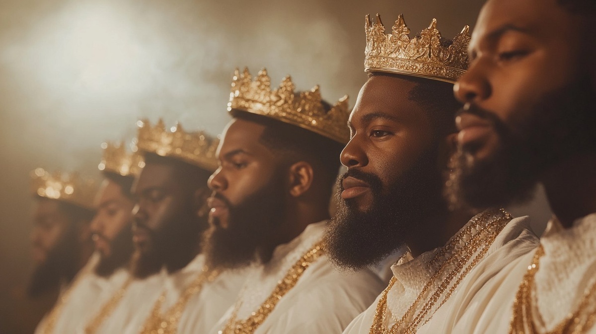 Создано на основе запроса: A group of African American men with beards stand mightily, their presence commanding attention. They are looking towards the left with confident, solemn expressions. Each man is dressed in elegant royal white garments, rich in texture and detail, flowing gracefully around them. Golden crowns sit perfectly atop their heads, fitting with precision and radiating an aura of power and authority. Soft white flares gently illuminate the image, adding a divine glow to the scene. The overall atmosphere is bathed in warm, brownish hues, enhancing the regal and majestic feel, while the light emphasizes their noble stature and the serene confidence they exude. --- Автоперевод: Группа афроамериканских мужчин с бородами стоят, их присутствие придает вниманию. Интересно получилось? 🤔 https://dzen.ru/id/65c0c65c86e4f837c27b24d7 #ИИ #AI #нейросеть #midjourney #art