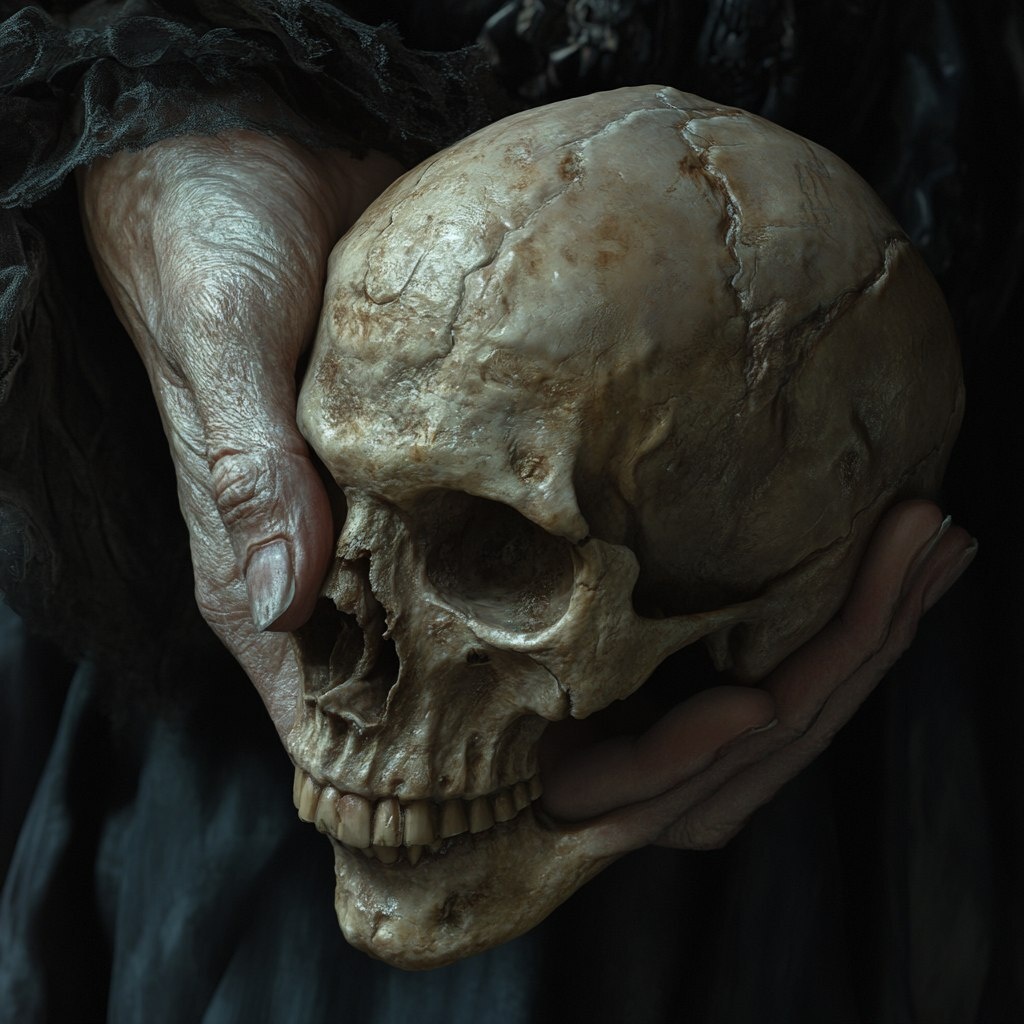 Создано на основе запроса: portrait of a very old femalehand , holding a human skull . Ultra realistic , 3d, 8k, Rembrandt light. Dystopia. Varm colours.