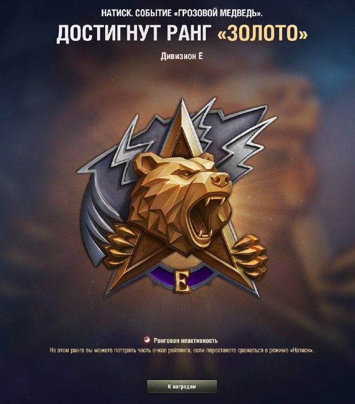 Летим-летим! 🔼📈 Золото взято! 🥇 В этом сезоне, гоняю только на дедушке 7м в красивом стиле из нового Боевого Пропуска - топовый!) P.S. Отдельно хочу выразить респект и благодарность коллеге Sandi_b - благодаря результативной игре которой и получилось попасть в золото, штурмуя дивизионы «Натиска» во взводе. 👍🤜🤛