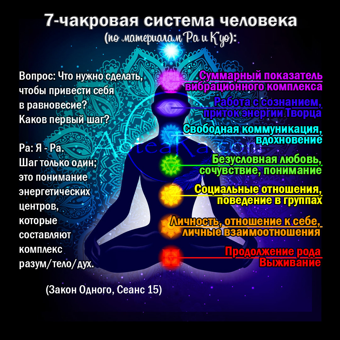 "Интервьюер: Что нужно сделать, чтобы привести себя в равновесие? Каков первый шаг? Ра: Я – Ра. Шаг только один; это понимание энергетических центров, которые составляют комплекс разум/тело/дух. Это понимание можно кратко изложить следующим образом: Первое уравновешивание – это уравновешивание вибрационного энергетического комплекса Малкут, или Земли, называемого комплексом красного луча. Понимание и принятие этой энергии является фундаментальным. Следующий энергетический комплекс, который может быть заблокирован, – это эмоциональный или личностный комплекс, также известный как комплекс оранжевого луча. Эта блокировка часто проявляется в виде личностных эксцентричностей или искажений в отношении самоосознанного понимания или принятия себя. Третья блокировка больше всего похожа на то, что вы называете эго. Это центр желтого луча или солнечного сплетения. Блокировки в этом центре часто проявляются как искажения в сторону власти, манипулирования и других видов социального поведения в отн