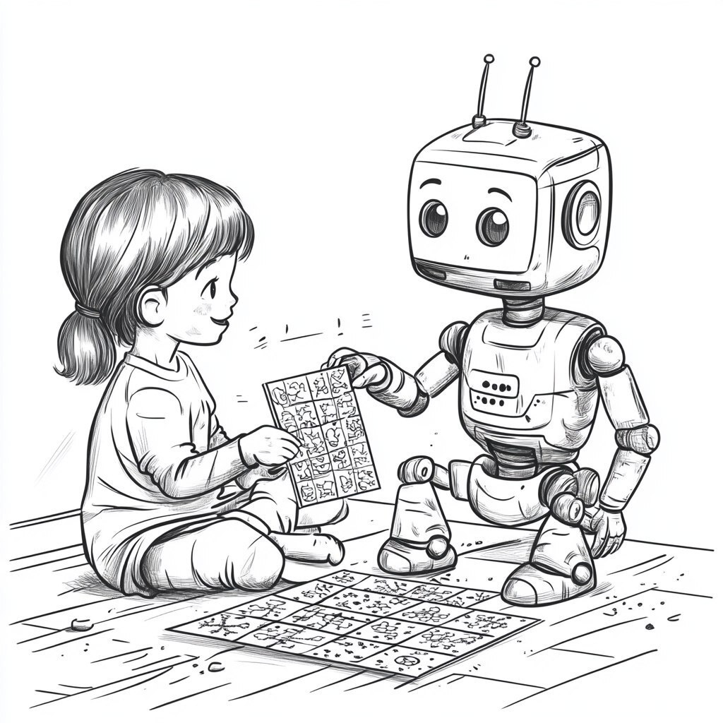 Создано на основе запроса: A friendly robot and a curious child sitting on the floor solving a big pattern puzzle together, black and white line art, clean and simple composition