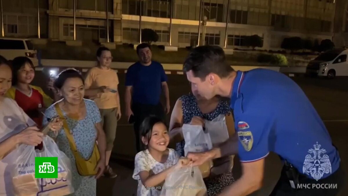 [ Смотреть видео на сайте НТВ ] МЧС России направило в Мьянму спасателей, кинологов и медиков, группировка насчитывает более 260 человек. В Мьянме жители Мандалая приехали в полевой лагерь МЧС России, чтобы поблагодарить спасателей за то, что помогают справиться с последствиями землетрясения. Для российских спасателей даже приготовили подарки. Последствия разгула стихии в Мьянме — помогают ликвидировать 260 специалистов МЧС России: спасатели, кинологи, психологи и врачи. По последним данным, в результате землетрясения погибли около трех тысяч человек. Пострадали более 4,5 тысячи человек, сотни числятся пропавшими без вести. Подземные толчки продолжаются, один из них магнитудой 5 произошел несколько часов назад. Напомним, 28 марта в Мьянме произошли разрушительные землетрясения магнитудой 7,7 и 6,4. По всей стране обрушились дома, дороги и мосты. В стране работают российские спасатели. Мощные подземные толчки почувствовали и в соседних странах, в том числе Таиланде и Китае. В Бангкоке п