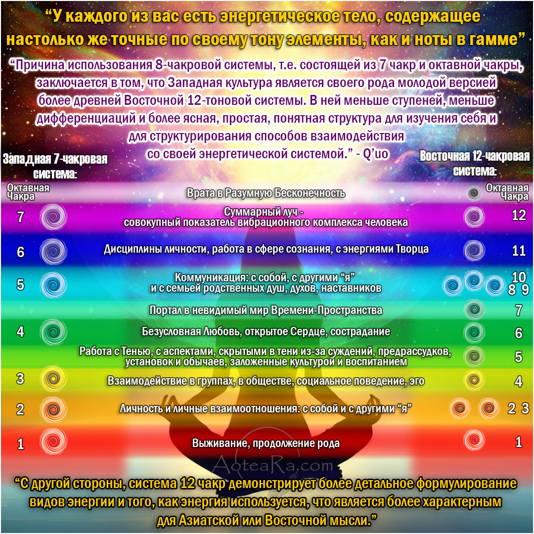 Причина использования восьмичакровой системы, то есть состоящей из семи чакр и октавной чакры, или восьмой, которая представляет собой то же самое, что и первая, только на октаву выше, заключается в том, что Западная культура является своего рода молодой версией более древней Восточной двенадцатитоновой системы. В ней меньше ступеней, меньше дифференциаций и более ясная, простая, понятная структура для изучения себя и для структурирования способов взаимодействия со своей энергетической системой.
