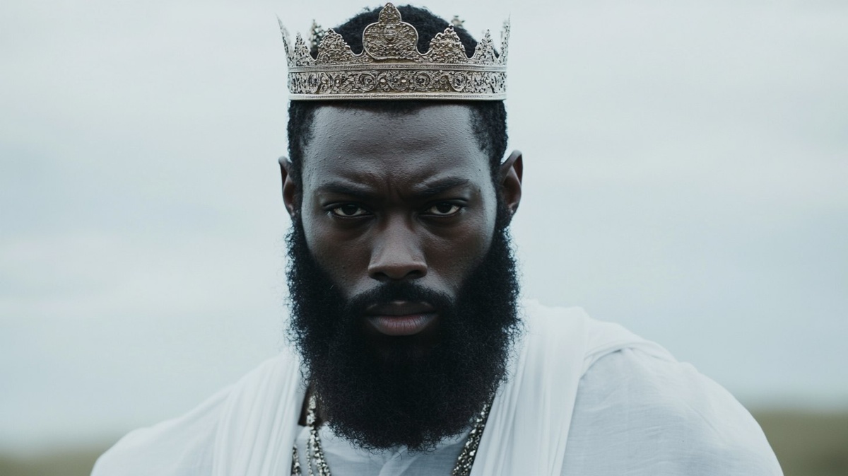 Создано на основе запроса: African American man standing mightly with beard, wearing glorious white garment, he has a holden crown on his