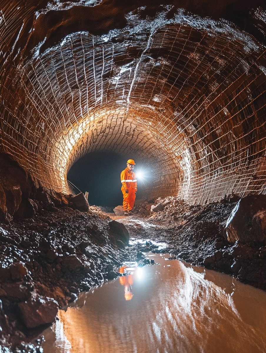 Создано на основе запроса: Photo of an underground tunnel in the South African Karoo region with large rocks and water on one side, and walls made up entirely from old metal mesh wire that has been cut into different shapes. A mine worker wearing orange overalls is standing at the entrance to talk about what they found inside it. The light illuminates him as well as his equipment, including a flashlight and helmet. --- Автоперевод: Фотография подземного туннеля в южноафриканском регионе Кару с большими камнями и водой с одной стороны, и стены, полностью составленные из старой металлической сетчатой проволоки, которая была разрезана в разные формы. Как тебе такая иллюстрация? 🤔 https://dzen.ru/id/65c0c65c86e4f837c27b24d7 #ИИ #AI #нейросеть #midjourney #art
