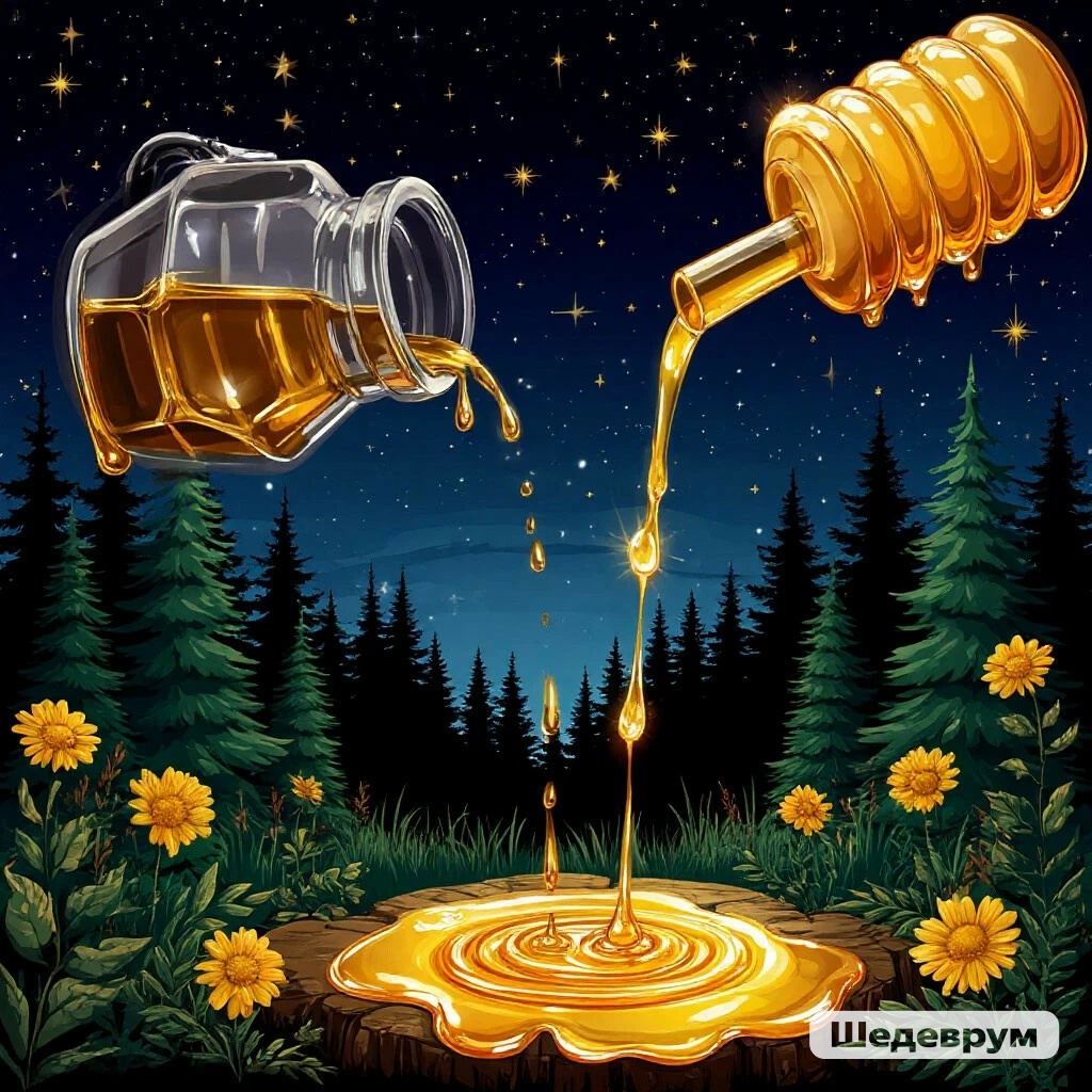Мед льётся на ночной еловый лес Там странник ходит по полям чудес Повсюду лужи меда, счастья лужи Здесь хорошо, ни ветра нет, ни стужи. Мед капает из этих дивных звезд Усыпан ими неба синий холст На капли меда бабочки летят Струится всюду сладкий аромат.