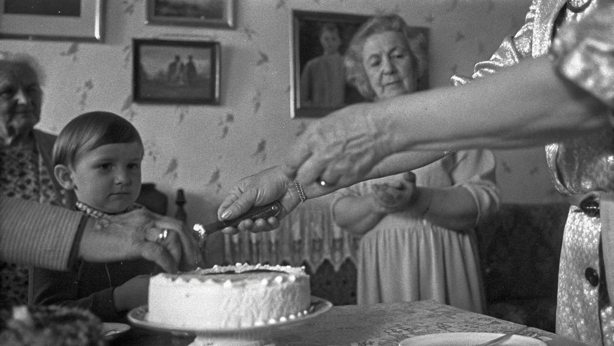 На столе — накрахмаленная скатерть, маленькие коробочки с подарками, завернутые в характерную для того времени упаковку. А на заднем плане — типичная советская гостиная: диван с цветочным рисунком, комнатные растения на подоконнике, картины в простых рамах. И этот молодой человек с фотоаппаратом "Зенит" или "Смена" — наверное, папа или старший брат именинника, старательно запечатлевающий момент, который точно станет частью семейной истории. Ведь фотографий тогда делали немного — каждый кадр был на вес золота, и выбирали для них только по-настоящему важные события.