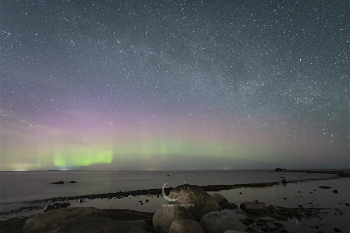 Фотографам также удалось поймать в объектив розово-зеленое северное сияние. Завораживающими кадрами поделились в telegram-канале @astrophotoboloto.