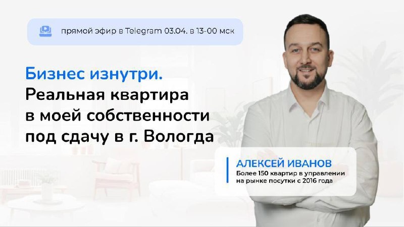 Прямой эфир: покажу свою квартиру, которую сдаю посуточно 03 апреля в 13:00 мск — включайтесь в прямой эфир в канале Telegram "Кухня посуточного бизнеса"! Покажу реальную квартиру в Вологде по адресу Республиканская, 30, которая находится в моей собственности и сдается посуточно. Развею миф, что бизнес на посуточной аренде — это только про субаренду. Поговорим про: – как работает объект в собственности, какая рентабельность, – как выглядит квартира изнутри и как она подготовлена, – на что обращают внимание гости при бронировании, – какие приёмы помогают повысить доходность с квартиры. Если вы только начинаете или уже в деле — этот эфир точно будет полезен. Добавьте себе в календарь и не пропустите! 03.04 в 13:00 мск — здесь, в Telegram-канале прямой эфир-экскурсия.