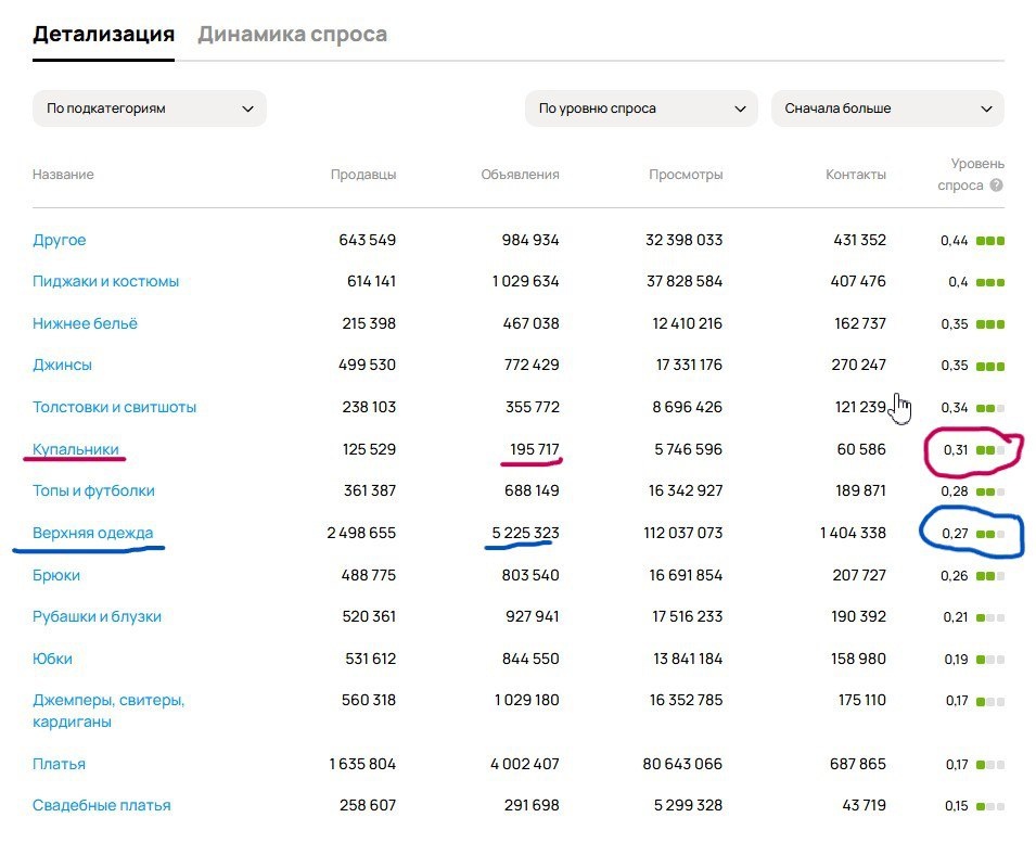 Внутри подкатегории Женская одежда ситуация в марте такова: максимальное количество продавцов и объявлений в Верхней одежде (синий цвет), а спрос невелик. А вот в подкатегории Купальники (красный) совсем мало продавцов и самих объявлений. Все боятся этого капризного товара, который нужно примерять, и конкуренция маленькая. 👌 Здесь ведь не только частники учитываются, это общая статистика. И вот еще интересно: глядя на прохожих на улицах и не скажешь, что пиджаки и костюмы более востребованы, чем толстовки и свитшоты. Здесь конечно, может менять статистику факт, что толстовки обычно дешевы, их доступно и новыми покупать. А о пиджаках такого не скажешь. Продажи на Авито с нуля