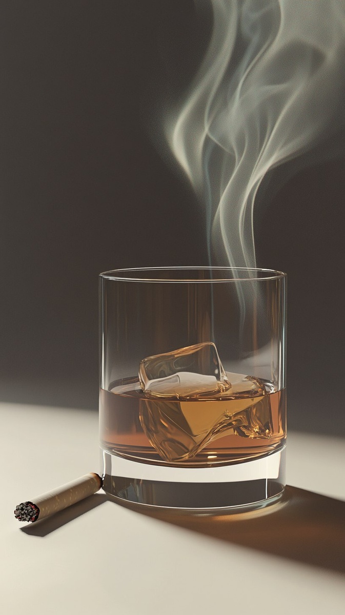 Создано на основе запроса: A highly realistic, minimalistic PNG-style image of a transparent glass with alcohol, slightly tilted, with golden liquid almost spilling over the edge. Next to it, a cigarette slowly burns, its smoke rising in delicate swirls. The objects seem to float in empty space, casting soft shadows beneath them. A subtle yet powerful symbol of silent dependency and the weight of habits. --- Автоперевод: Очень реалистичное, минималистичное изображение в стиле PNG прозрачного стекла с спиртом, слегка наклоненное, с золотой жидкостью, почти пролившейся по краю. Хорошо вышло? 🤔 https://dzen.ru/id/65c0c65c86e4f837c27b24d7 #ИИ #AI #нейросеть #midjourney #art