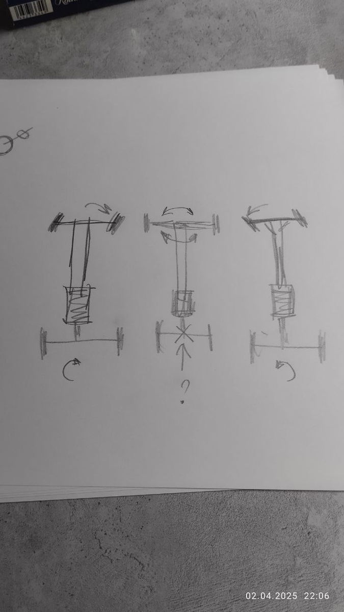 В исполнении четырех колес это не сработает точно. Задние колеса будут эту схему тормозить и мешать наклонам для поворотов