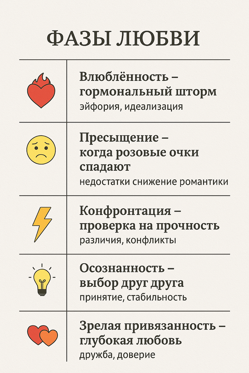Любовь — это не статичное чувство, а динамический процесс, который проходит несколько этапов. В начале кажется, что эмоции будут вечными, но со временем отношения меняются. Как не потерять любовь и сохранить близость? Давайте разберём основные фазы любви.