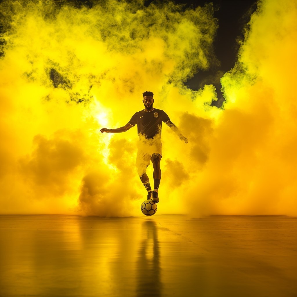 Создано на основе запроса: a black male freestyle footballer with a ball balancing on his shoe standing in a studio full of yellow neon smoke --- Автоперевод: Черный футболист из фристайла с мячом с балансом на его обуви, стоящей в студии, полной желтого неонового дыма Необычно выглядит? 🤔 https://dzen.ru/id/65c0c65c86e4f837c27b24d7 #ИИ #AI #нейросеть #midjourney #art