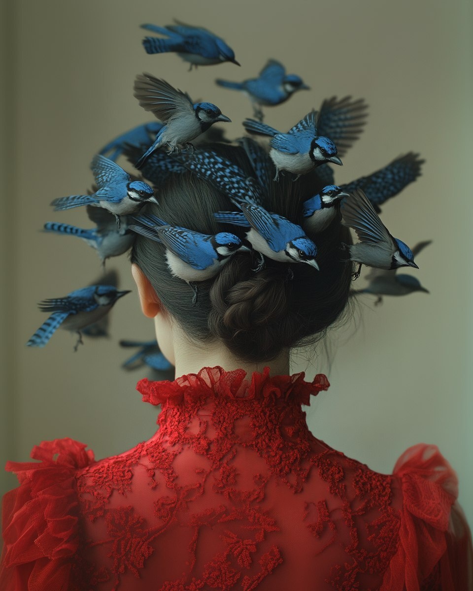 Создано на основе запроса: photo in the style of Mark Ryden. bottom half of the woman's head normal facing away from camera, red dress, and top reveals an opening from which a flock of Blue Jays emerges, Dramatic lighting, surreal composition, cinematic framing, ultra-detailed, 8K, masterpiece. in the style of Geof Kern