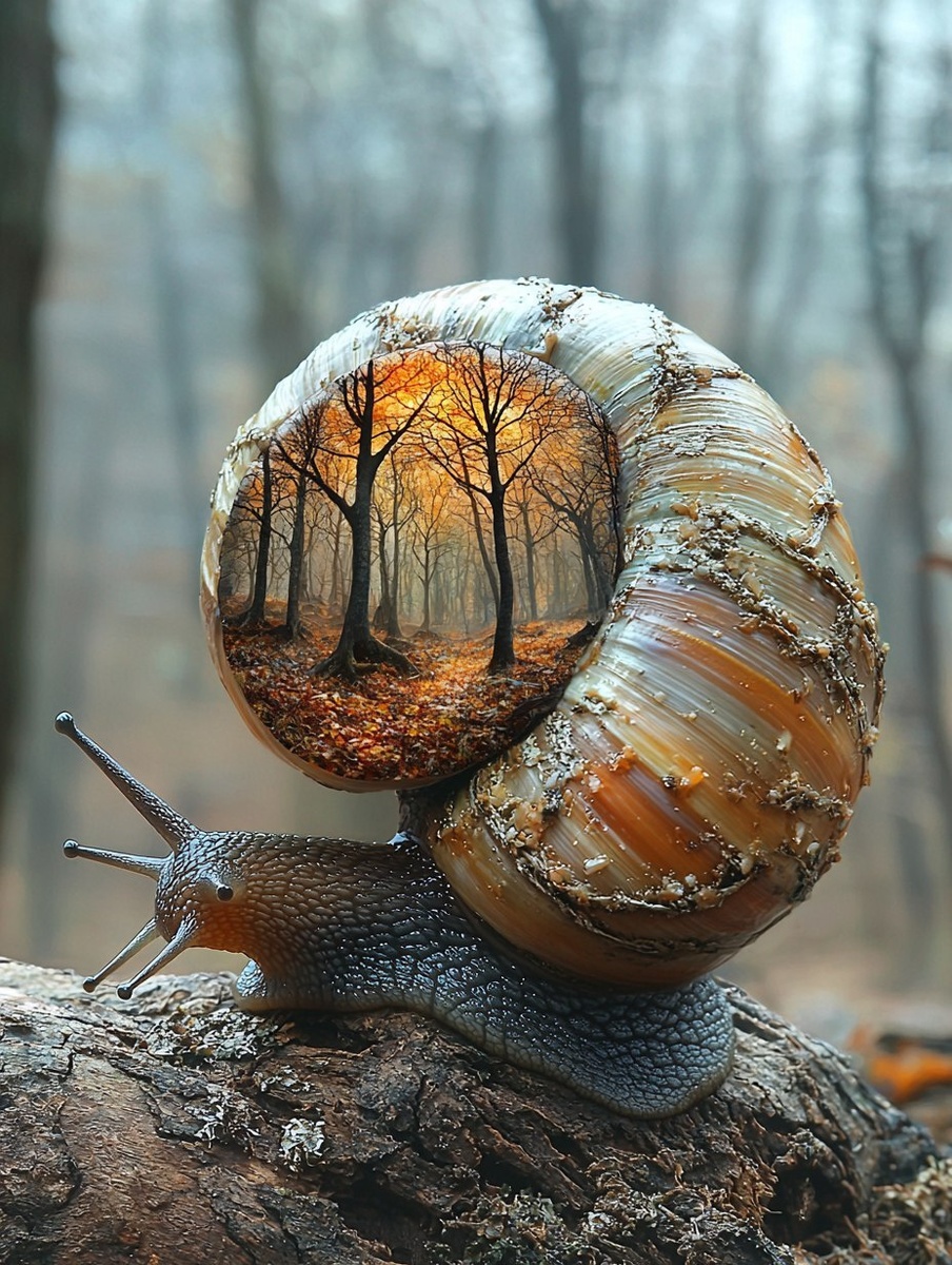 Создано на основе запроса: surreal depiction of a Forest Landscape summarized inside the shell of snail crawling on a log