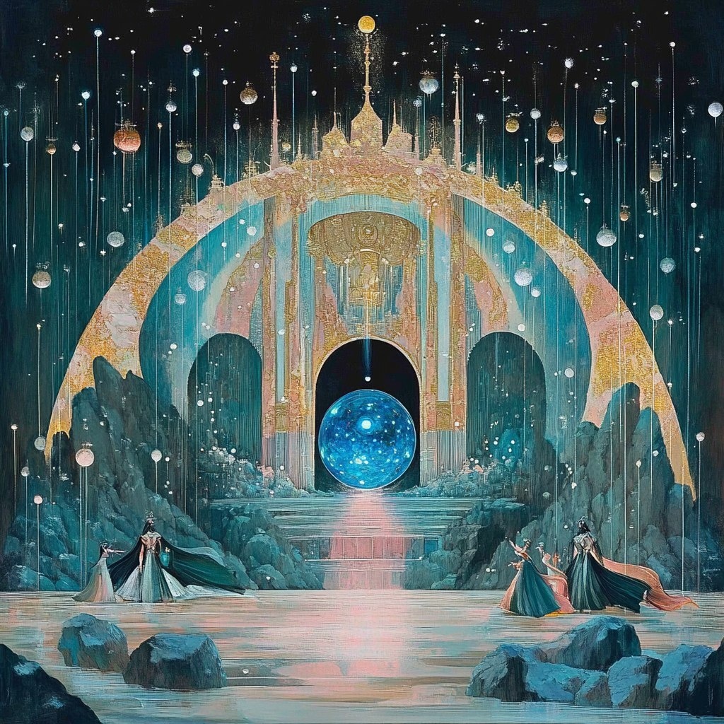 Создано на основе запроса: Disney style, 2D, illustration, a mural depicting the legendary Temple of Resonance - a vast underground cavern with a huge dome so high that it is invisible, inlaid with countless sound spirit stones, and in the middle is the God of Resonance, whose tears became the original blue crystal. A blue crystal appears in the middle of the picture, line illustration, Mucha style, gilded --- Автоперевод: Стиль Диснея, 2 -й, иллюстрация, фреска, изображающая легендарный храм резонанса - обширная подземная пещера с огромным куполом, настолько высоким, что он невидим, инкрустирован бесчисленным звуковым духовным камнями, а посередине находится бог резонанса, чьи слезы стали оригинальным синим кристаллом. Необычно получилось? 🤔 https://dzen.ru/id/65c0c65c86e4f837c27b24d7 #ИИ #AI #нейросеть #midjourney #art