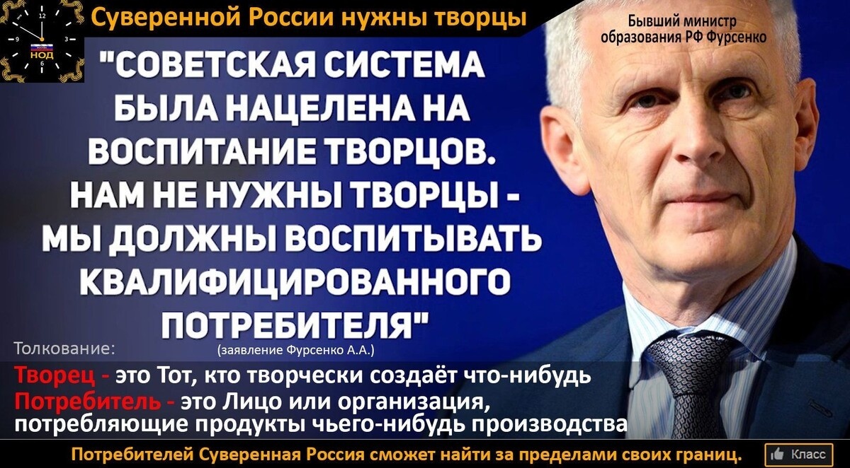 И в любом споре про образовании очень любят "цитировать Фурсенко". Вроде все уже привыкли к этой фразе и все ее перепечатывают не рефлексируя, особенно любят этим заниматься тупые поклонники СССР (именно тупые, есть и умные!!) и очень они любят эту фразу к месту и не к месту цитировать... Однако. как обычно и бывает с подобными фразами найти первоисточник оказывается практически невозможно, ведь фразу перепечатали тысячи людей. А ведь на самом деле, как и с другими крылатыми фразами, например "нет человека - нет проблемы" или "в ссср секса нет", автор говорил о другом, а саму фразу вырвал из контекста и растиражировал крикливый лжец. В случае с Фурсенко - лживый коммунист Смолин, ложный герой наших дней в своей речи где-то. Ранее уже палившийся на откровенном вранье про "опрос общественного мнения, проведенный ФАПСИ" (ФАПСИ правда к тому времени давно не существовало, и опросов оно не проводило - но что до этих мелочей коммунисту?). Что же на самом деле говорил министр, причём нео