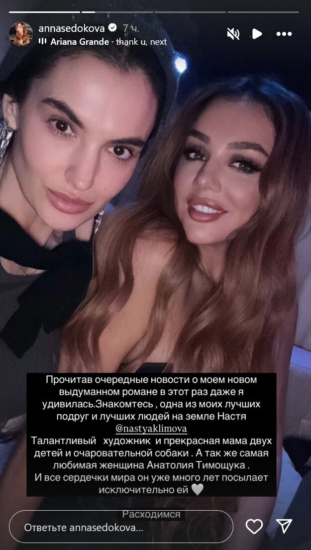 «Муз ТВ» сообщает, что недавно бывшая участница группы «ВИА Гра» опубликовала фото роз, полученных от «таинственного поклонника». К корзине с цветами была прикреплена открытка с нарисованным сердечком. В связи с тем, что Седокова стала часто появляться на играх «Зенита», а член тренерского штаба клуба Анатолий Тимощук, по словам очевидцев, посылал ей сердечки с поля, возникло предположение, что между ними возникли романтические отношения. Седокова решила прокомментировать эту информацию и выложила совместное фото с Анастасией Климовой, супругой экс-футболиста сборной Украины. «Прочитав очередные новости о моем новом выдуманном романе, в этот раз даже я удивилась. Знакомьтесь, одна из моих лучших подруг и лучших людей на свете, Настя. Талантливый художник и прекрасная мама двух детей и очаровательной собаки. А также самая любимая женщина Анатолия Тимощука. И все сердечки мира он уже много лет посылает исключительно ей. Расходимся», – написала поп-исполнительница. Ранее Седокова была опр