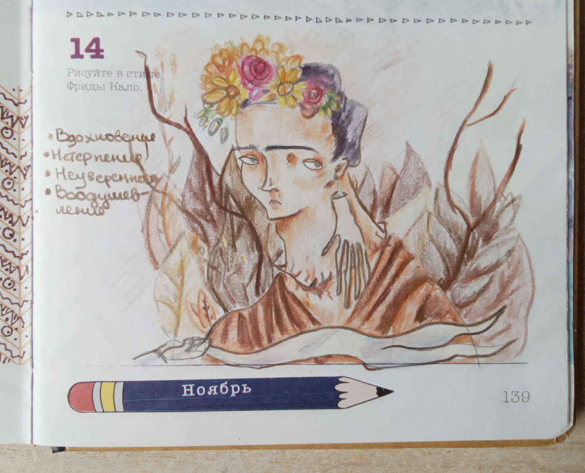 Образ в моем стиле в стиле Фриды Кало Всем чернично-космический привет! Вот такое задание было в творческом "Sketch-ежедневнике 365 идей для скетчинга". Думаю, кто читал мои выпуски из этого блокнота, помнит это задание. Надеюсь, моя публикация вдохновит вас на выполнение этого интересного задания. Сегодня решила к нему вернуться, как как у меня есть что добавить. А именно - акварельную иллюстрацию. Кажется, я её ещё не публиковала. Когда я прочитала задание, то не сразу определилась, как буду его выполнять. Пришлось пересмотреть картины художницы для вдохновения. Нашла подходящую, рассмотрела и решила, что буду рисовать образ в своём стиле в стиле Фриды Кало. Скетч получился, на удивление, быстро. Выполняла его цветными карандашами. Осталась довольна работой. Даже обилие коричневых оттенков в этом образе меня не раздражает. Нарисовала, отложила, отправилась на прогулку. А в голове все крутился нарисованный образ. Пока гуляла, возникло сильное желание изобразить его в акварели. Пр