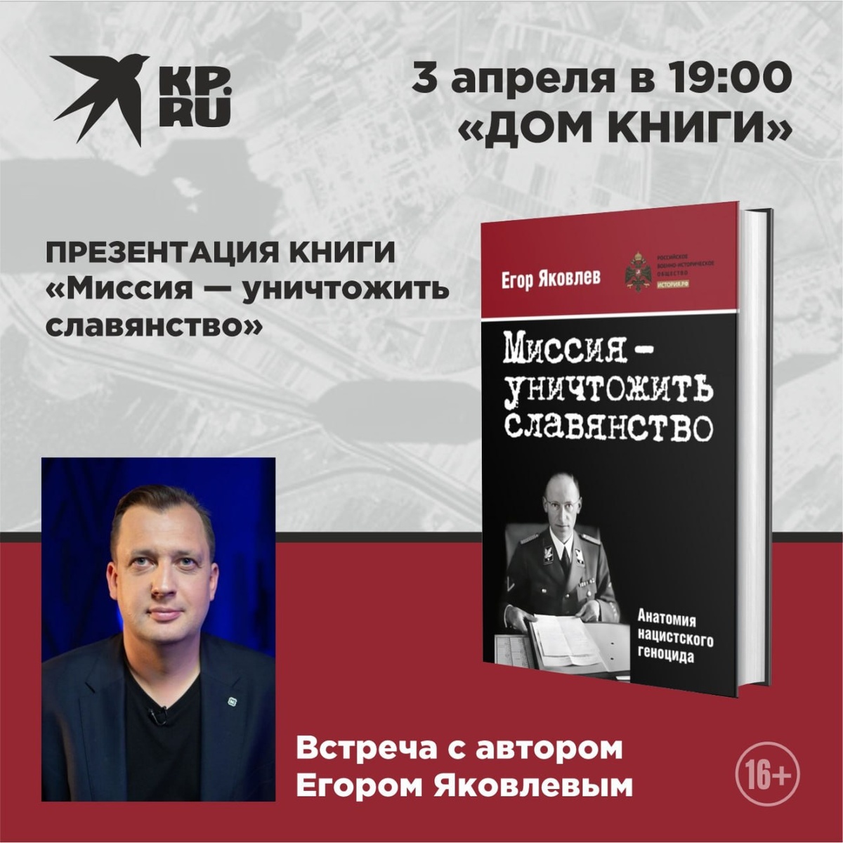 3 апреля в «Доме книги» пройдет презентация книги «Миссия — уничтожить славянство», которая вышла в издательстве «Комсомольская правда». Автор, Егор Яковлев — историк, создатель проекта «Цифровая история» и лауреат премии «Знание», рассказывает о нацистской политике геноцида против народов СССР. В книге раскрываются малоизвестные факты о плане Гитлера по уничтожению 20–30 миллионов советских граждан зимой 1941–42 годов, а также о том, как нацисты вдохновлялись колониальной политикой Запада, превращая Восточную Европу в «жизненное пространство» за счет уничтожения и порабощения местного населения. В книге используется научный подход к проблематике геноцида без фальсификаций и домыслов, а также впервые подробно поднимается тема геноцида славян. Ждем вас на презентации 3 апреля «Дом книги» Вход свободный Подпишись на Комсомольскую правду: СПб — отдай свой буст нам
