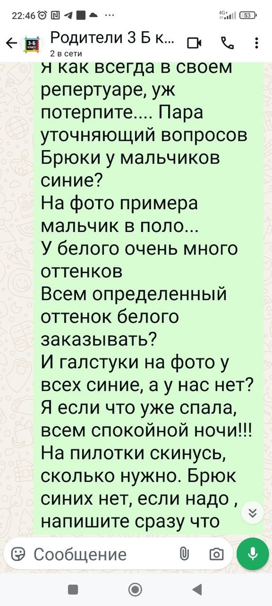 Ночь придет, пройдет пора прекрасная . Город засыпает, просыпается мафия!!!!! Мафия родительских чатов!!! И так на кону у нас Пилотки!!!! Стартовая цена 1000 рублей на весь класс!!! Кто больше!!!!! Но, я то без стëба не могу! Особенно если меня разбудили.... А как у вас проходит?