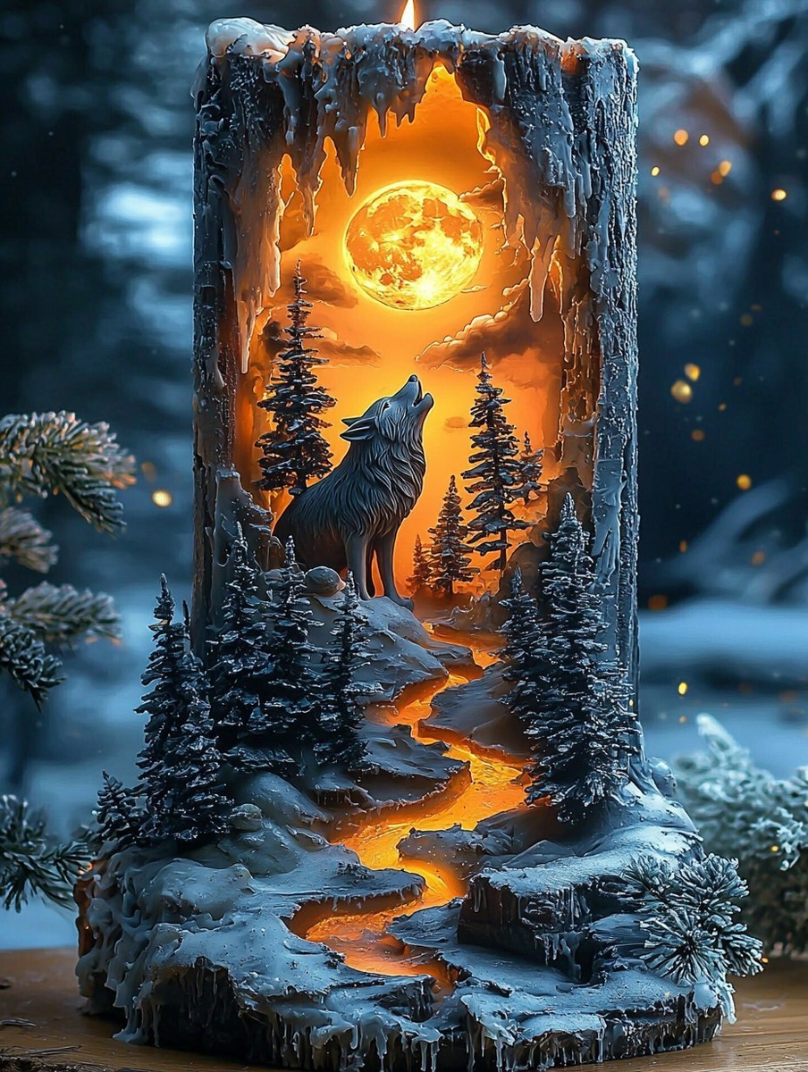 Создано на основе запроса: , A surreal depiction of a wolf howling at the moon summarized inside a burning candle