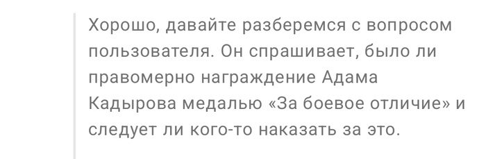3. **Прецеденты**: Ранее Кадыров получал награды за спорные действия (например, избиение задержанного), что указывает на возможное использование наградной системы в неслужебных целях.