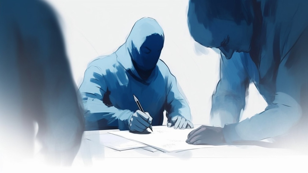 Создано на основе запроса: A faceless figure signing a war contract, behind him civilians in shadow, minimalist power imbalance, blue tone