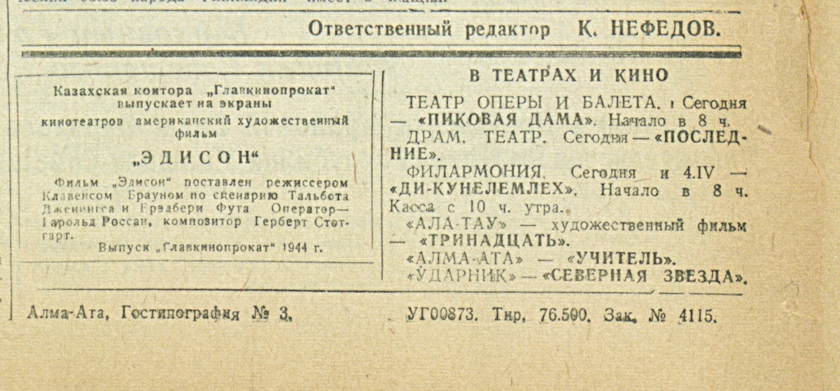 В этот день, 3 апреля 1945 года, газета «Казахстанская правда» публикует афишу театров и кино. В Алма-Ате показывали биографическую ленту «Эдисон» (в оригинале «Эдисон, человек», «Edison, the Man») об изобретателе Томасе Эдисоне. Выпущенный компанией Metro-Goldwyn-Mayer в 1940 году, фильм был номинирован на премию «Оскар» за лучший сценарий Казахская контора „Главкинопрокат“ выпускает на экраны кинотеатров американский художественный фильм „Эдисон“. Фильм „Эдисон“ поставлен режиссёром Клавенсом Брауном по сценарию Тальбота Дженингса и Брэдбери Фута. Оператор Гарольд Россан, композитор Герберт Стотгарт. Выпуск „Главкинопрокат“ 1944 г. В ТЕАТРАХ И КИНО Театр оперы и балета. Сегодня — «Пиковая дама». Начало в 8 ч. Драм. театр. Сегодня — «Последние». Филармония. Сегодня и 4.IV — «Ди-Кунелемлех». Начало в 8 ч. Касса с 10 ч. утра. «Ала-Тау» — художественный фильм — «Тринадцать». «Алма-Ата» — «Учитель». «Ударник» — «Северная Звезда». («Казахстанская правда», 3 апреля 1945 г., вторник). ххх РЕ