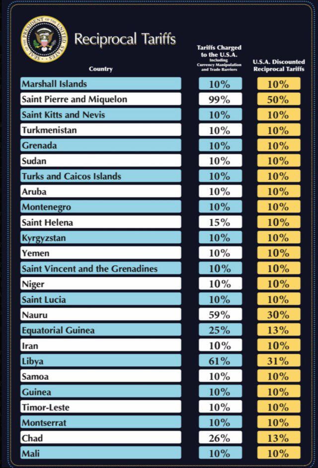 Полный список "взаимных пошлин" США на другие страны (желтые столбцы)