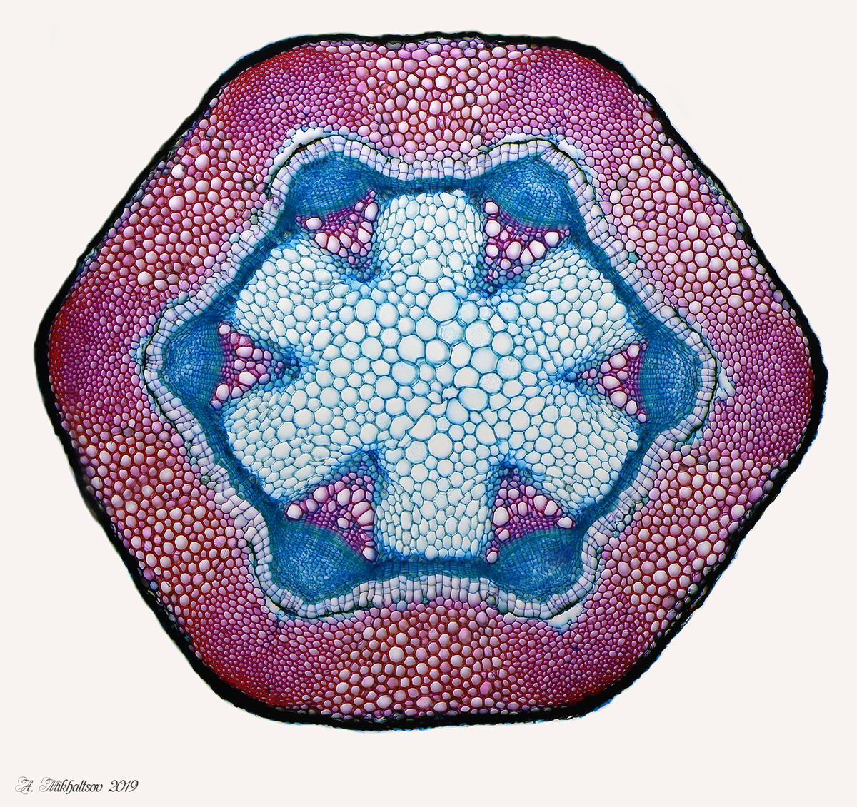 После окраски делают срез толщиной 5 микрометров — чтобы увидеть каждую клетку в отдельности. Это тоньше человеческого волоса в 20 раз.