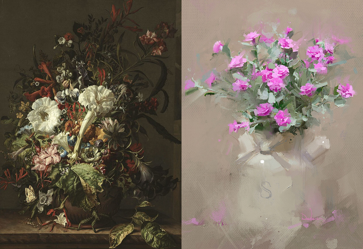 Детализация полезна только в минимальных дозах. Если переборщить — неминуема передозировка. Как быть, если цветочков много? Самый простой способ — выбрать несколько в центре и прописать их с пристрастием. Остальные обобщить — размазать или не дописывать вовсе. Скучно детализированные и монотонно проиллюстрированные цветочки слева создают визуальный шум, мусор из деталей, свалку избыточных перечислений. Справа — цельно и гармонично, несмотря на обилие соцветий, к тому же совершенно одинаковых. Тут есть гармония. Ритм, чистота, настроение. Слева гармонии нет и быть не может, потому что, если нажать все клавиши на фортепиано одновременно — будет шум, а не музыка. Цветочки слева звучат все сразу, перебивая друг друга. Если вам нравится вариант слева — я вам искренне завидую. Вы в самом начале пути к совершенству. Вся красота еще впереди. Поднимайтесь на следующую ступеньку развития — записывайтесь на мой авторский мастер-класс живописи маслом в ближайшее воскресенье. Покажу, расскажу и зам